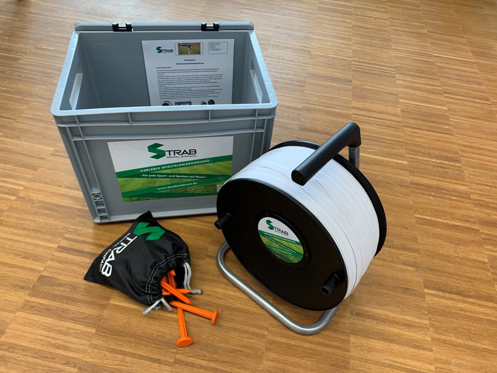 Mobile Spielfeldmarkierung der Firma Bands & More. Ob für Jugendspiele, spezielle Trainingsformen oder für den Aufbau von Parcours (Sportabzeichen, Sichtungswettkämpfe, etc.) innerhalb kürzester Zeit kann ein optimales, individuelles Spielfeld aufgebaut werden.